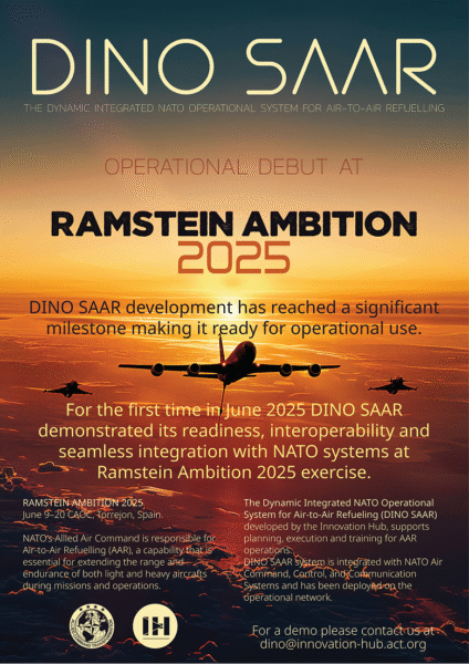 During the Ramstein Ambition 2025 and Steadfast Duel 2025 exercises, ACT Innovation, AIRCOM, and NEC CCIS SSC operationally deployed and tested DINO SAAR, a mission planning, execution, and training system for Air-to-Air Refuelling.