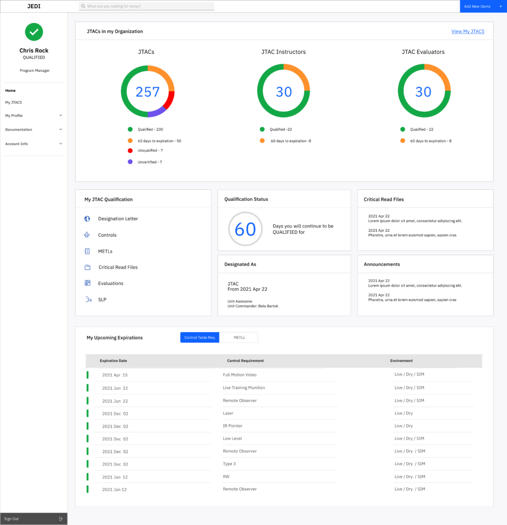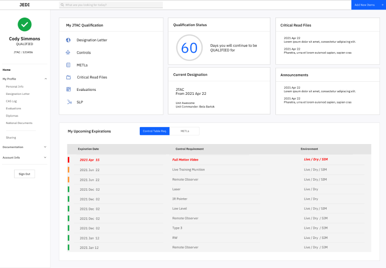 With JEDI, tracking of JTAC currencies and qualification can be standardized across all nations. This will improve communication within individual nations, and within NATO. JEDI offers a reliable way to access and store data, eliminating the manual work associated with calculating a JTAC’s qualification.