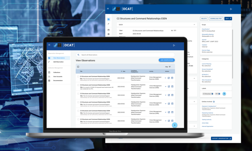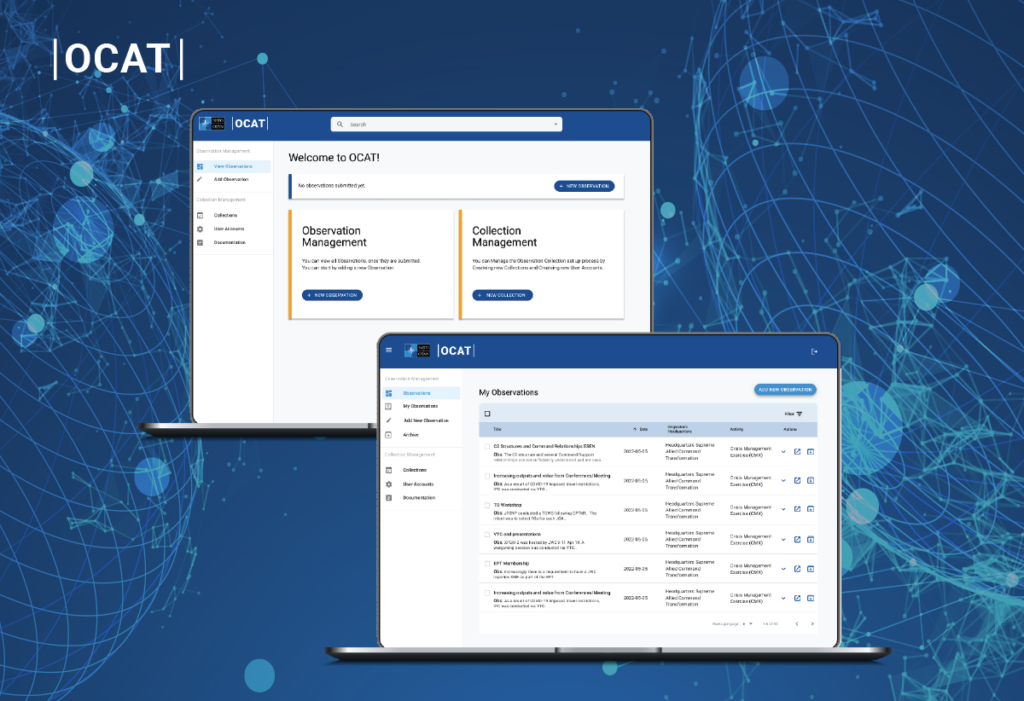 The Observation, Collection and Analysis Tool, or “OCAT” allows Observations to be easily recorded by Staff Officers in the field or during a planned exercise within open and/or restricted networks, being deployed locally, it is designed to be used in any environment.